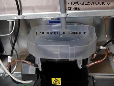 В задней части холодильника в нижней части находится резервуар, в который через трубку попадают скопления влаги. Часто при неосторожной транспортировке, перемещении холодильника этот агрегат может выйти из строя и вызвать протечку. При этом внутреннее пространство будет сухим, в морозилке не будет наледи и лишнего льда, но на полу периодически будет образовываться небольшая лужица с водой.