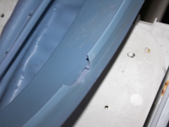 Основным признаком неисправной манжеты является потеря воды во время стирки, полоскания и отжима. На этой резинке появляются царапины, трещины и дыры.