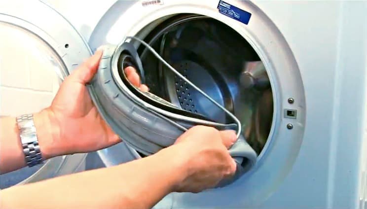 Некоторые техники удаляют уплотнительную резину для замены, не снимая переднюю крышку машины, что сокращает время, необходимое для выполнения ремонта. Просто установить браслет на стиральную машину Самсунг изнутри будет намного сложнее.