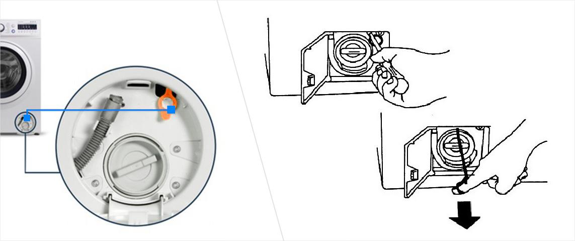 Чтобы самостоятельно справиться с такой поломкой, нужно убрать воду. В этом вам поможет шнур аварийной разблокировки или ручной слив. Обе части расположены в правом нижнем углу машины рядом с фильтром