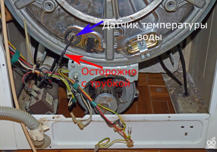 - Снизу резервуара вы увидите, что из его стенки выступают 2 контакта. Это шток ТЭНа — сам ТЭН находится под барабаном. Снимите проводку с ТЭНа и датчика (находятся внутри ТЭНа).