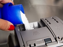 2. Моющие средства. Необходимо приобретать специальные моющие средства, предназначенные для посудомоечных машин: порошок, ополаскиватель, соль. Такие очистители дорогие, но служат долго.