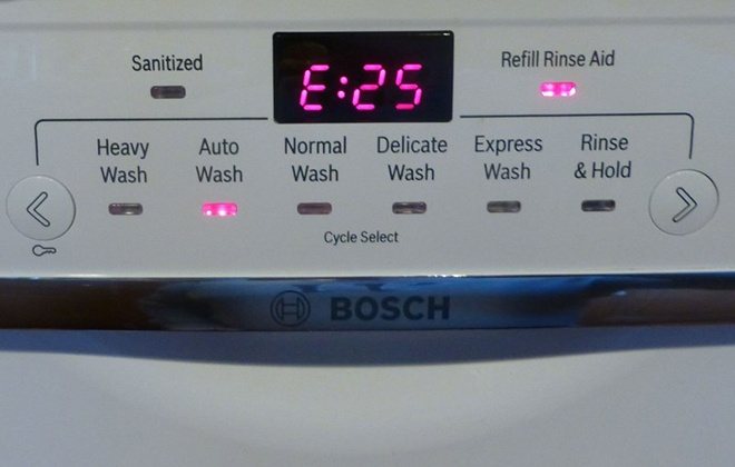 В конструкции посудомоечных машин Bosch установлен блок самодиагностики, который отображает коды ошибок. Список кодов и объяснений см. В руководстве пользователя посудомоечной машины Bosch. Например, ошибка Е09 свидетельствует о выходе из строя проточного электрического водонагревателя, установленного внутри корпуса. Ремонт заключается в установке новой детали и очистке жидкостных магистралей. Для установки деталей и диагностики мы рекомендуем вам обратиться в сервисный центр, который обслуживает посудомоечные машины Bosch.