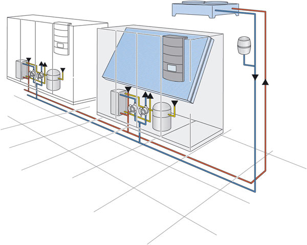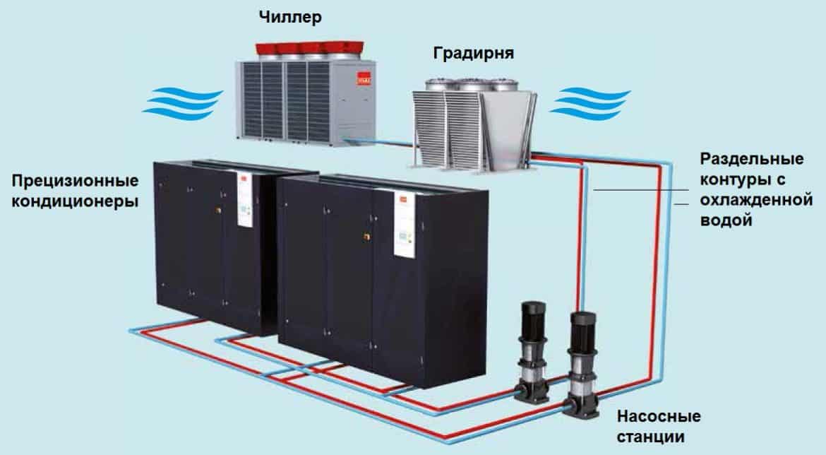 Схема подключения прецизионных кондиционеров к чиллеру и градирне.