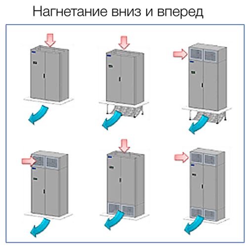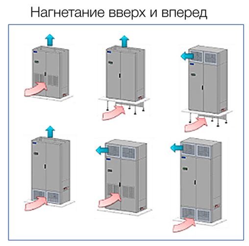 Впуск нагретого воздушного потока и выпуск охлажденного воздушного потока происходит несколькими способами. Например, рассмотрим прецизионный кондиционер MAXAERO-TECHNO POLAR BEAR. Каталог производителя предлагает следующие варианты: