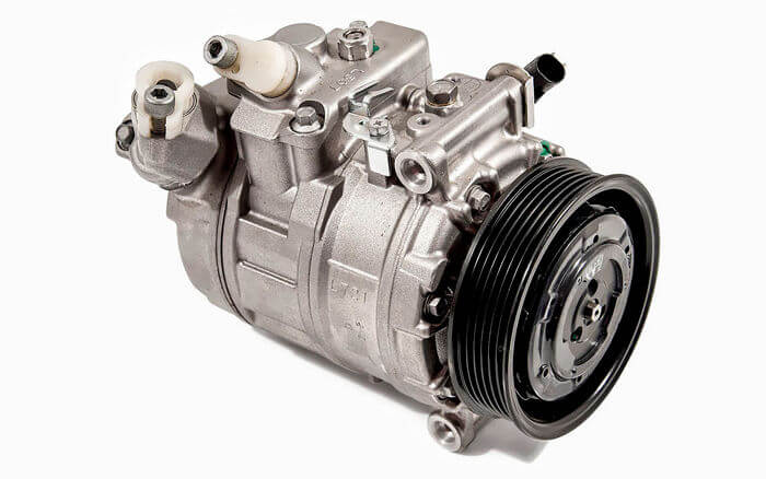 Сложный компонент системы охлаждения, обеспечивающий в своей работе сжатие изобутана в газообразной форме. В настоящее время при изготовлении климатического оборудования используются компрессоры с аксиально-поршневой или пластинчато-роторной схемой. Основным источником энергии является двигатель машины. Связь между ним и системой обеспечивают приводные ремни и диски, электромагнитные муфты.