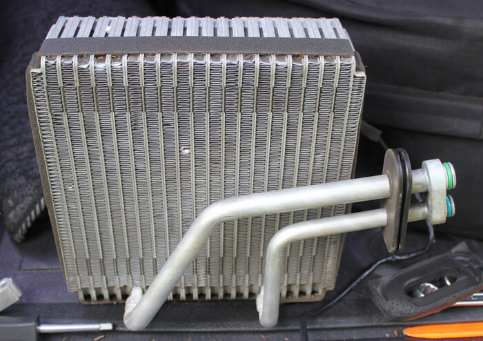 Внешне похож на конденсатор, но в уменьшенном виде. Это также похоже на змеевик, который включает в себя несколько трубок в системе, по которой течет ледяной фреон. Он предполагает формирование притока холодного воздуха, который проникает из салона под действием вентилятора. Процесс по этой схеме осуществляется в обратном порядке.