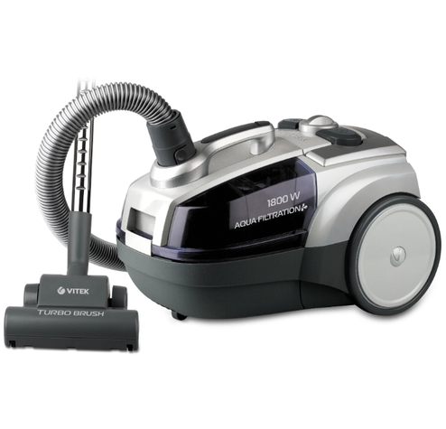 - ВИТЭК ВТ-1833 (Россия). Хороший вариант среди бюджетных пылесосов. Мощность всасывания — 400 Вт. Оснащен фильтром HEPA и 5-ступенчатой фильтрацией воздуха. К пылесосу производитель поставляет набор аксессуаров, в том числе турбощетку для чистки шерсти домашних животных.