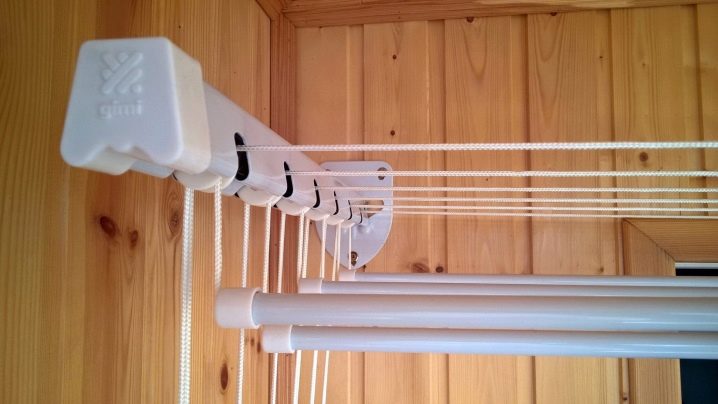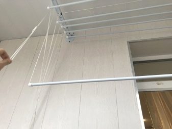 Независимо подвесные сушилки установить немного сложнее. Все колышки крепятся к двум рейкам на потолке, но к каждой из них идет веревка, позволяющая опускать / поднимать стержни для подвешивания одежды. Тогда при установке, помимо установки перекладин на потолок, необходимо закрепить на соседней стене брус, на котором крепятся тросы. Направляющие этого типа потолочной сушилки могут быть изготовлены из пластика, стали с порошковым покрытием (Gimi) или алюминия (Liana). Можно встретить деревянные балки других производителей, но перечисленные выше представлены большим количеством моделей.