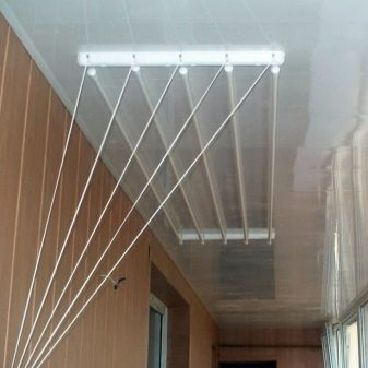 Дизайн напоминает настенную модель балконной сушилки. Монтаж осуществляется на потолке балкона, а подъемный механизм расположен на стене.