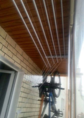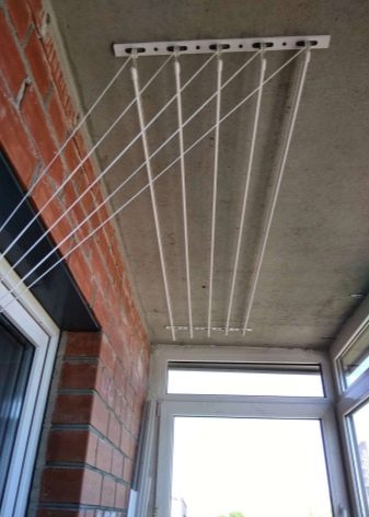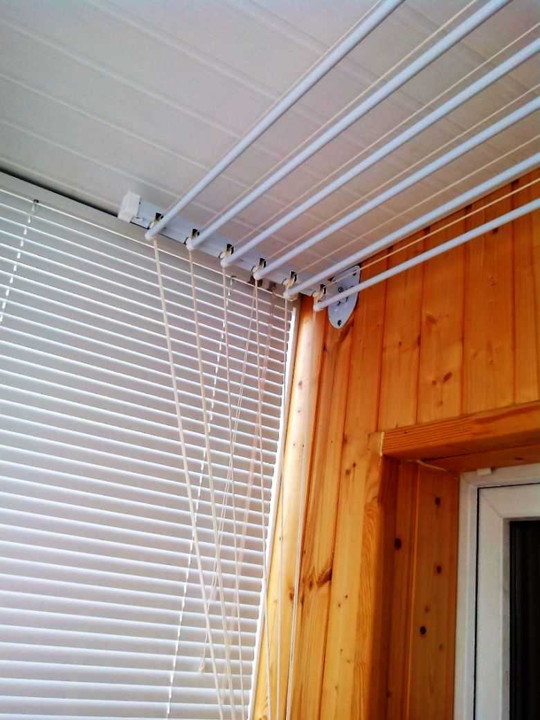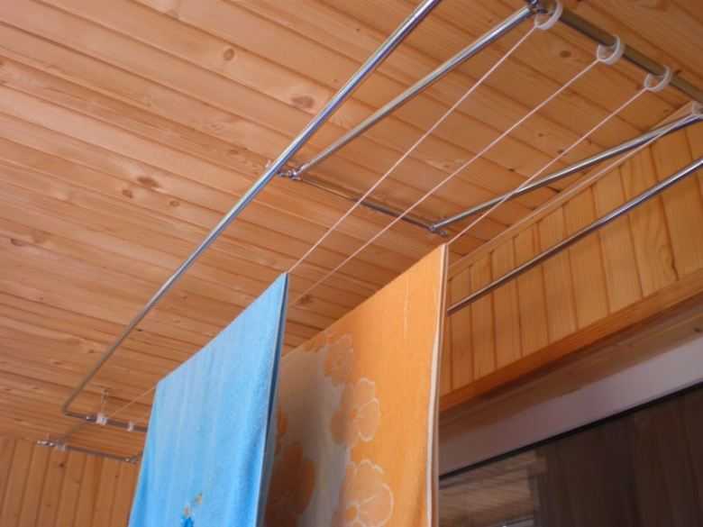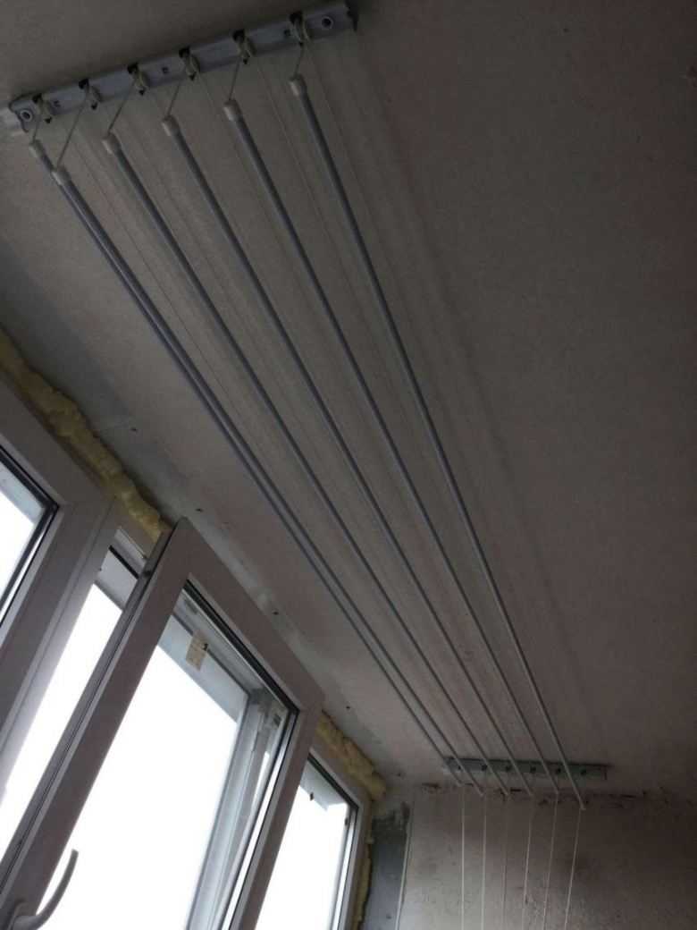 Сушилки, устанавливаемые на потолок балкона или лоджии, — одни из самых популярных моделей. Это две рейки с прикрепленными к ним перемычками или веревками, на которые вешается белье.