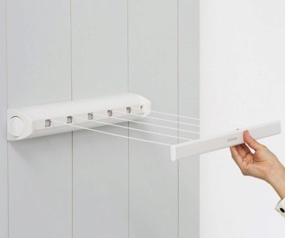 Классический простой вариант: к стене прикрепляется столько крючков, сколько нужно, и к ним прикрепляются веревки для белья. Требуемое натяжение всегда можно отрегулировать, а крючки всегда остаются в одном положении. В принципе, даже такое устройство практически не занимает места и подходит даже для ограниченного пространства. Многие хозяйки считают, что именно эта сушильная система является самой надежной из всех.