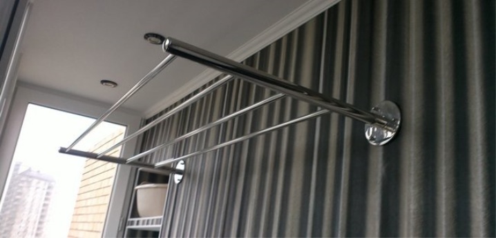 - Стационарный вариант. Он состоит из двухметровых труб, установленных между двумя опорами. Конструкция, которая постоянно находится на балконе, отличается высокой прочностью.