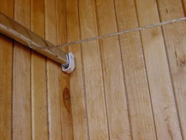 - Стационарный вид. В основе устройства — прикрученные к стене крючки, на которых крепятся веревки. Параметры силы натяжения тросов и высоты сушилки можно регулировать только при установке системы.
