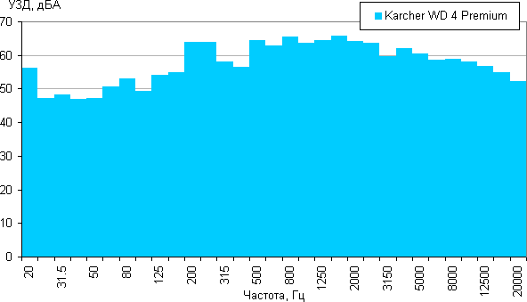 Уровень звукового давления достигает 74,6 дБА. Следует отметить, что в случае «обычного» пылесоса, который не является новым и не бесшумным (заявленная электрическая мощность 1800 Вт), при тех же условиях мы получили 76 дБА при максимальной мощности. Можно предположить, что в классе уличных пылесосов тестируемый человек средний по шумности. Мы также даем уровень звукового давления (SPL) в диапазоне 20-20000 Гц в 1/3 октавных полосах.
