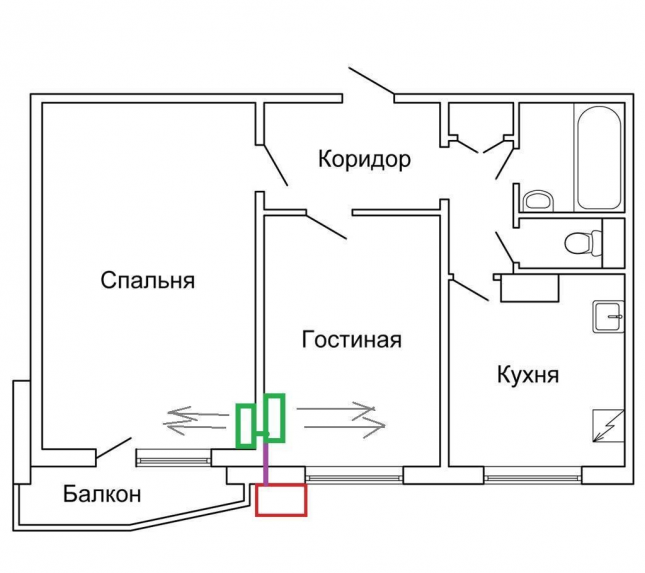 - Основной поток холодного воздуха будет сосредоточен в коридоре, где семьи не задерживаются надолго. Благодаря отсутствию сквозняков в жилых комнатах риск простудных заболеваний исключен.