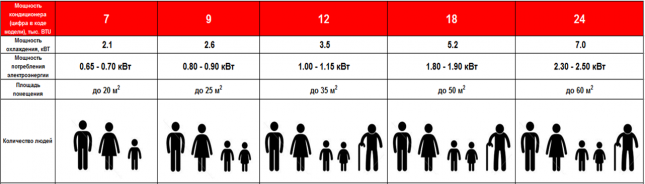 Главный параметр, который необходимо учитывать при выборе такой техники, — холодопроизводительность или холодопроизводительность. Это число может быть указано как в киловаттах, так и в британских специальных тепловых единицах (БТЕ). Зависимость мощности от охлаждаемой площади простая — на 1 кв. М. Требуется 1 кВт (или 3412 БТЕ). На кондиционерах разных производителей можно встретить два типа маркировки: