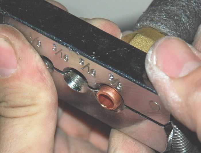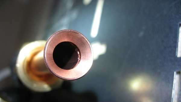 При расширении трубки держите отверстие внизу. Опять же, чтобы частицы меди не попадали внутрь, а высыпались на пол. В держателе он фиксируется так, что выступает наружу на 2 мм. Собственно, ни много, ни мало. Скрепляем трубу, ставим развальцованный конус, поворачиваем, прилагая солидные усилия (труба имеет толстые стенки). Зенковка завершена, когда конус больше не идет. Повторяем операцию с другой стороны, затем с другой трубки.