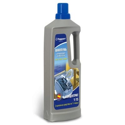 Шампунь Topperr выпускается в бутылке объемом 1 литр. Емкость очень удобна в использовании. Одной упаковки продукта хватит на несколько чисток. Подходит для всех моделей пылесосов, имеет приятный аромат.