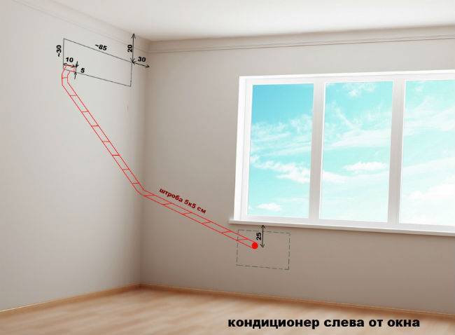 - если кондиционер устанавливается при проведении общих ремонтных работ, то при установке часто используется закрытая конструкция. Оборудован специальным каналом в стене. Прокладывает кабель. Один конец подключается к распределительному щиту, а другой крепится к выходу розетки. На финальном этапе канал закрывается. При этом не портится интерьер помещения. На электропроводку не влияют негативные внешние факторы;