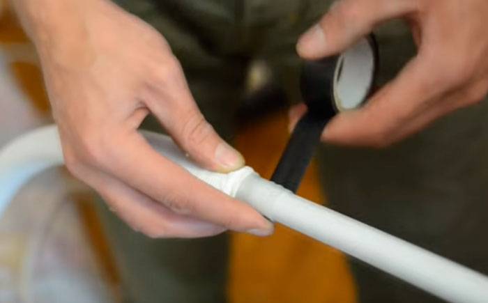 Здесь важно не наступить на нее по ошибке, потому что медь — мягкий материал и легко скручивается. Обогреватели ставятся на обе трубы, диаметр которых зависит от мощности оборудования. На соединительный кабель наносится гофра, все детали собираются и перематываются липкой лентой