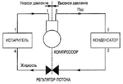 Из кондиционера (3) хладагент, уже находящийся в жидком состоянии, возвращается в испаритель (4) через регулятор потока в условиях низкого давления. Воздух в помещении нагревает жидкость, происходит закипание и переход в пар. И так процесс повторяется бесконечно.