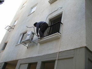 Для начала нужно выбрать место для крепления снаружи — это зависит от того, где в квартире повесить кондиционер. Наиболее удобное место для навешивания снаружи — под окном, справа или слева от окна, в зависимости от положения окна на стене. В случае такого расположения внешней части кондиционера установку можно произвести самостоятельно без посторонней помощи. В случае сложной архитектуры комнаты или помещения (сложное расположение углов и окон) самостоятельная установка зачастую невозможна с точки зрения соблюдения техники безопасности персонала, и в этом случае необходимо прибегать к помощь промышленных альпинистов. Но это крайние меры для сложных типов построек; в обычных квартирах типового дома такие меры обычно не нужны. Но даже при несложной установке на данном этапе работ необходима помощь другого человека, для обеспечения безопасности, страховки и помощи в работе (вес наружного блока 20-70 кг, в зависимости от шаблона).