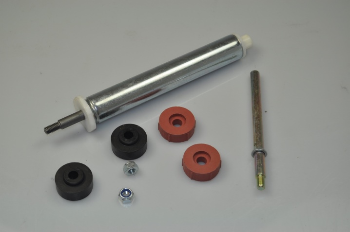 Этот тип амортизатора называется пружинно-поршневым амортизатором и представляет собой цилиндрическое металлическое устройство, в котором расположена втулка. Шток перемещается в нем во время работы. Сверху есть специальная посадка для резиновых вставок, с помощью которых он соединяется с барабаном.