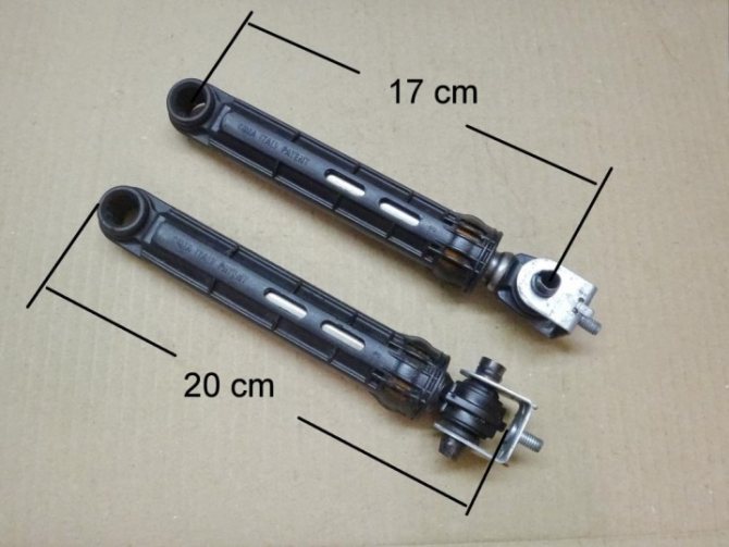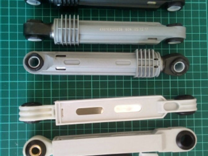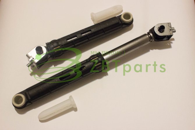 Амортизаторы не являются универсальными деталями, поэтому их внешний вид может различаться в зависимости от модели устройства, для которой они были изготовлены. Каждая разновидность предназначена для работы с определенной массой вещей, загружаемых в барабан. Стоит отметить, что в бытовых приборах амортизатор способен поглощать колебания 40-180 Н, а для профессиональных агрегатов этот показатель намного выше.